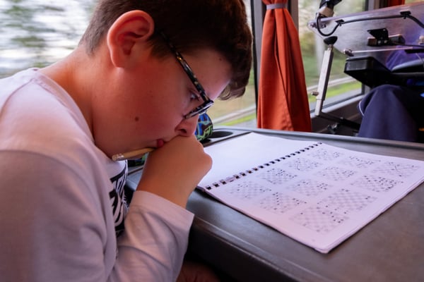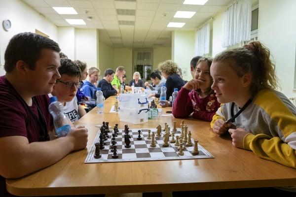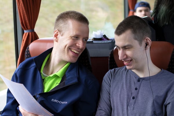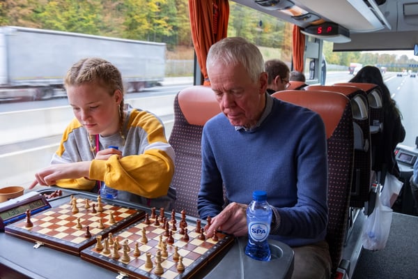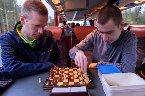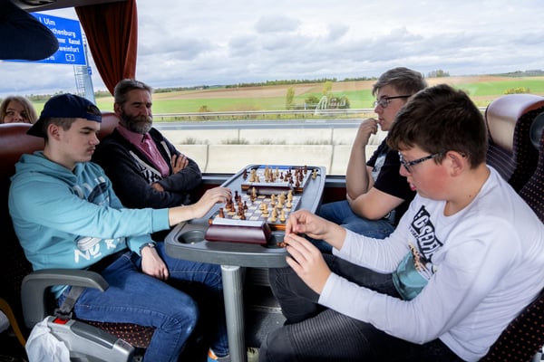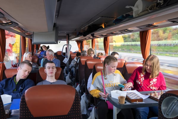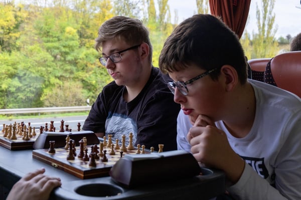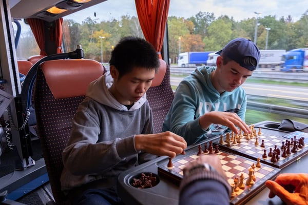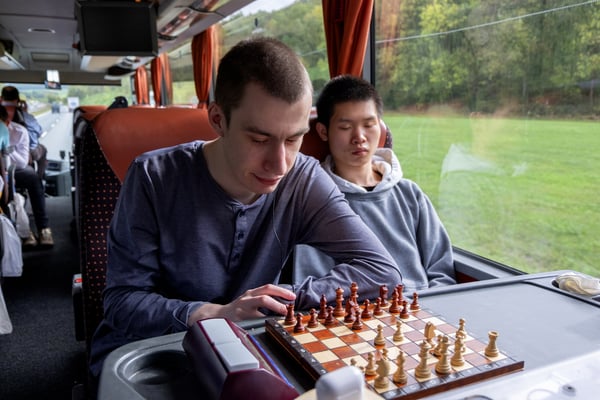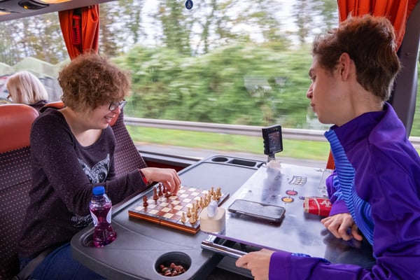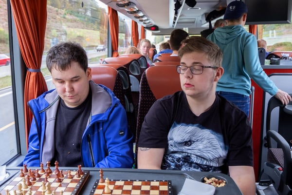 We zijn vanmorgen rond 07.30 uur vanaf het Adelante College te Valkenburg aan de Geul met een aangepaste bus en met chauffeur Aiko Kunst vertrokken naar het schaaktoernooi in Praag. Onderweg werd al flink geoefend in de bus en de eerste schaakpartijen waren een goede voorbereiding op de wedstrijden van de komende dagen. Sommige deelnemers overtroffen hun leermeester! Dit belooft veel voor het komende toernooi. Tegen de avond arriveerden wij bij het Revalidatiecentrum in Praag. Nadat de bus was uitgeruimd en iedereen zijn koffer naar de kamer had gebracht, werd gezamenlijk genoten van verschillende heerlijke pizza’s. Uiteindelijk zocht iedereen zijn kamer op voor een telefoon loze nacht.