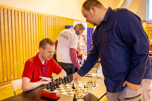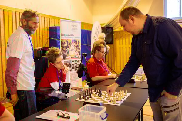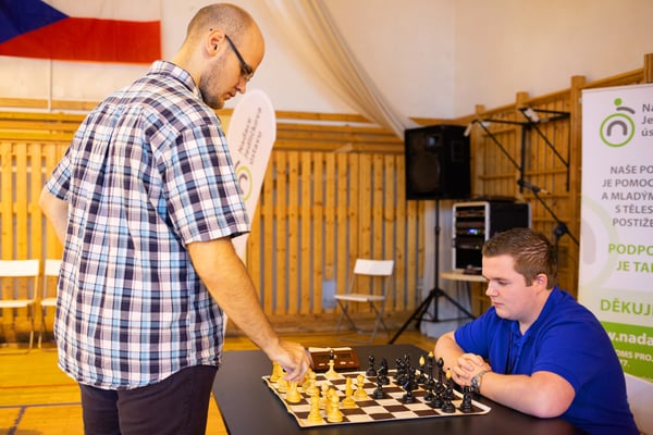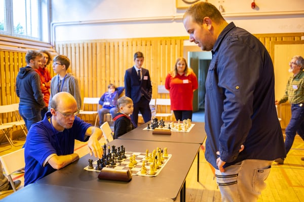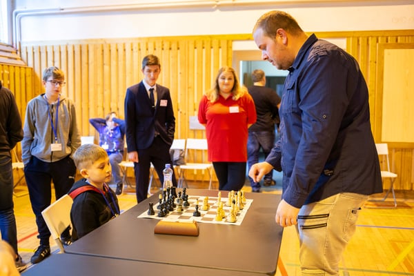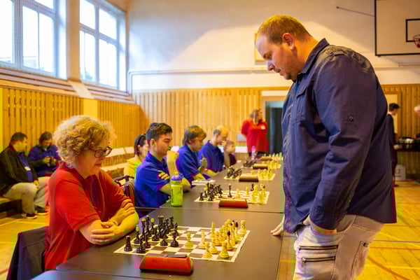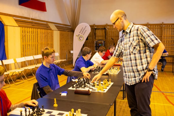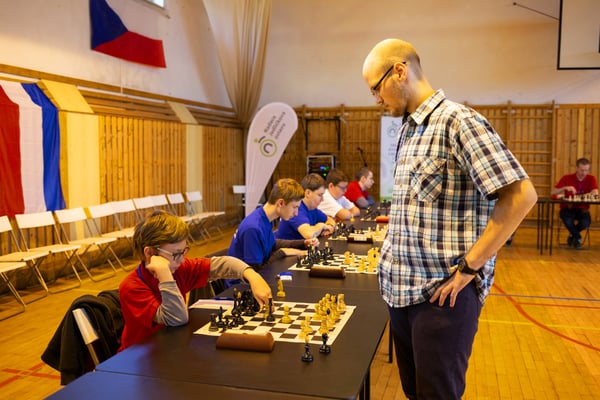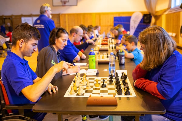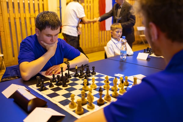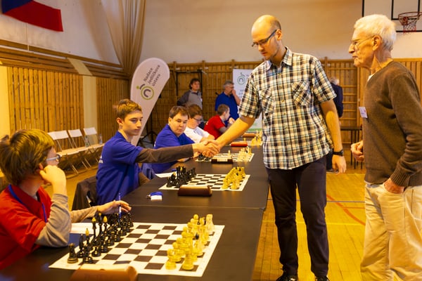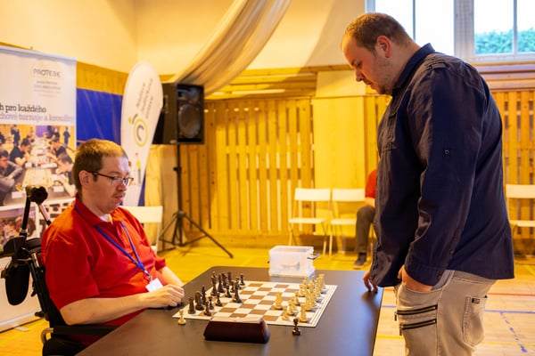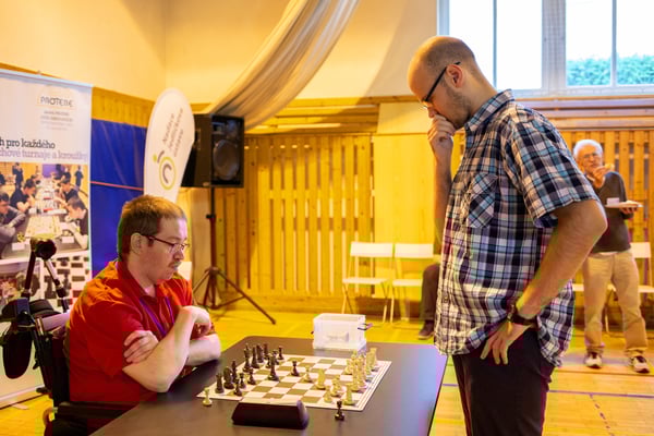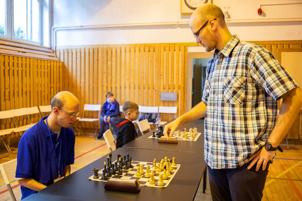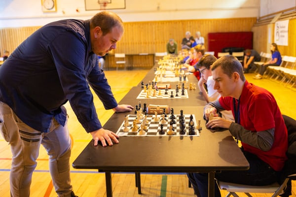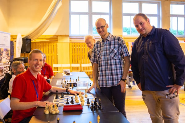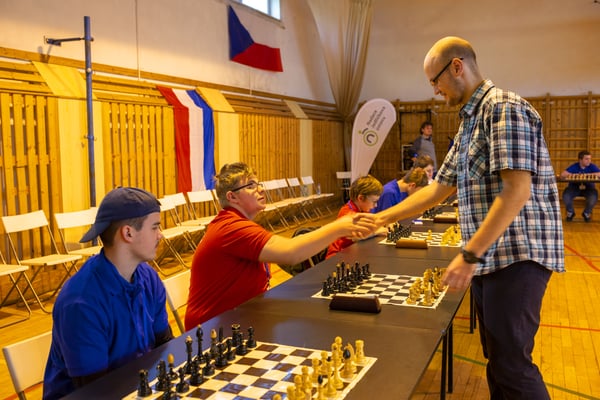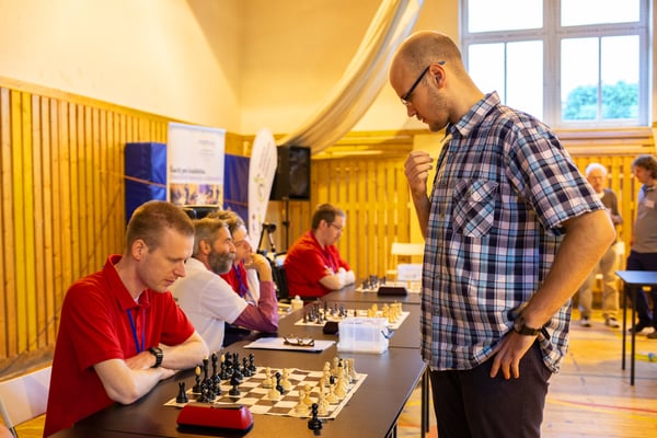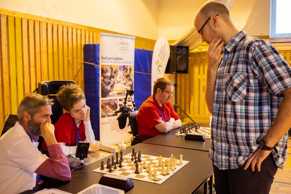 Na een voortreffelijk ontbijt werden de deelnemers uitgenodigd voor een simultaan wedstrijd tegen twee hele goede schakers uit Tsjechië, waarvan een International Master. Verschillende van onze deelnemers hebben goed gepresteerd, ze hebben op tijd gewonnen. Een van onze schakers (Peter Keune) wist binnen de reguliere tijd een remise af te dwingen. Hij kreeg hier veel waardering voor van zijn tegenstander Josef Havenka, International Master (ELO 2350).